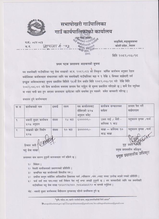 पशु सेवा शाखा, सभपाोखरी गा.पा. को प्रस्ताव आव्हान सम्बन्धी सूचना ।