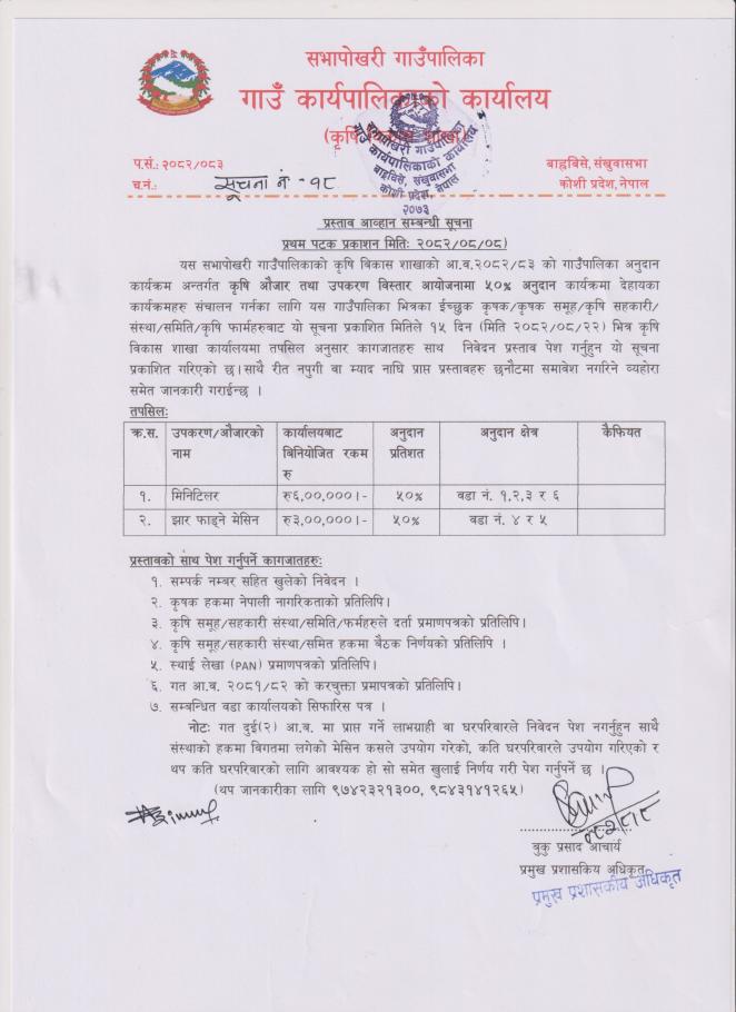 पशु सेवा शाखा, सभपाोखरी गा.पा. को प्रस्ताव आव्हान सम्बन्धी सूचना ।